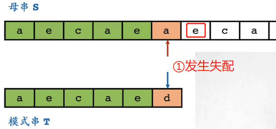 - Find the ① and ③ of the pattern string, using the green characters after ① to match the orange characters at the mismatch position after ②