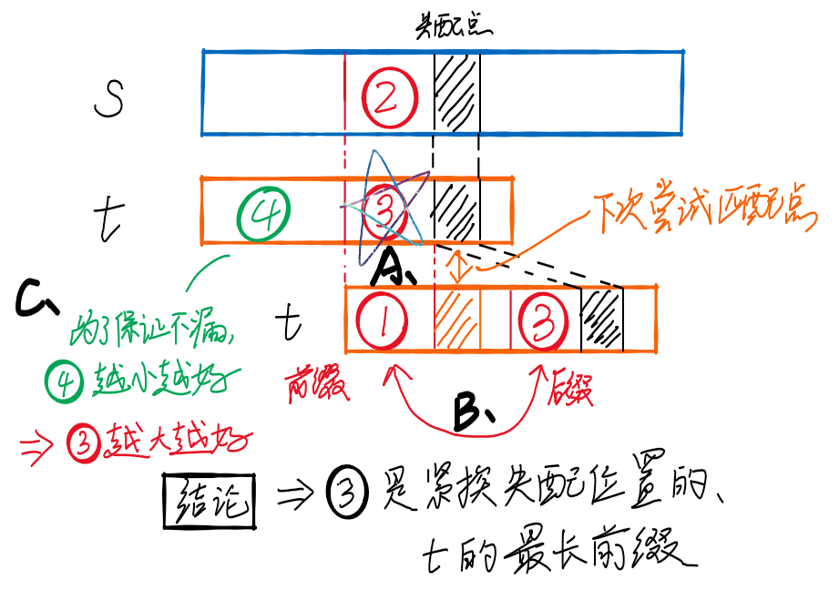 - Conclusion: In summary, through ③, the matching process can be accelerated, and ③ is the longest prefix of $t$ adjacent to the mismatch position