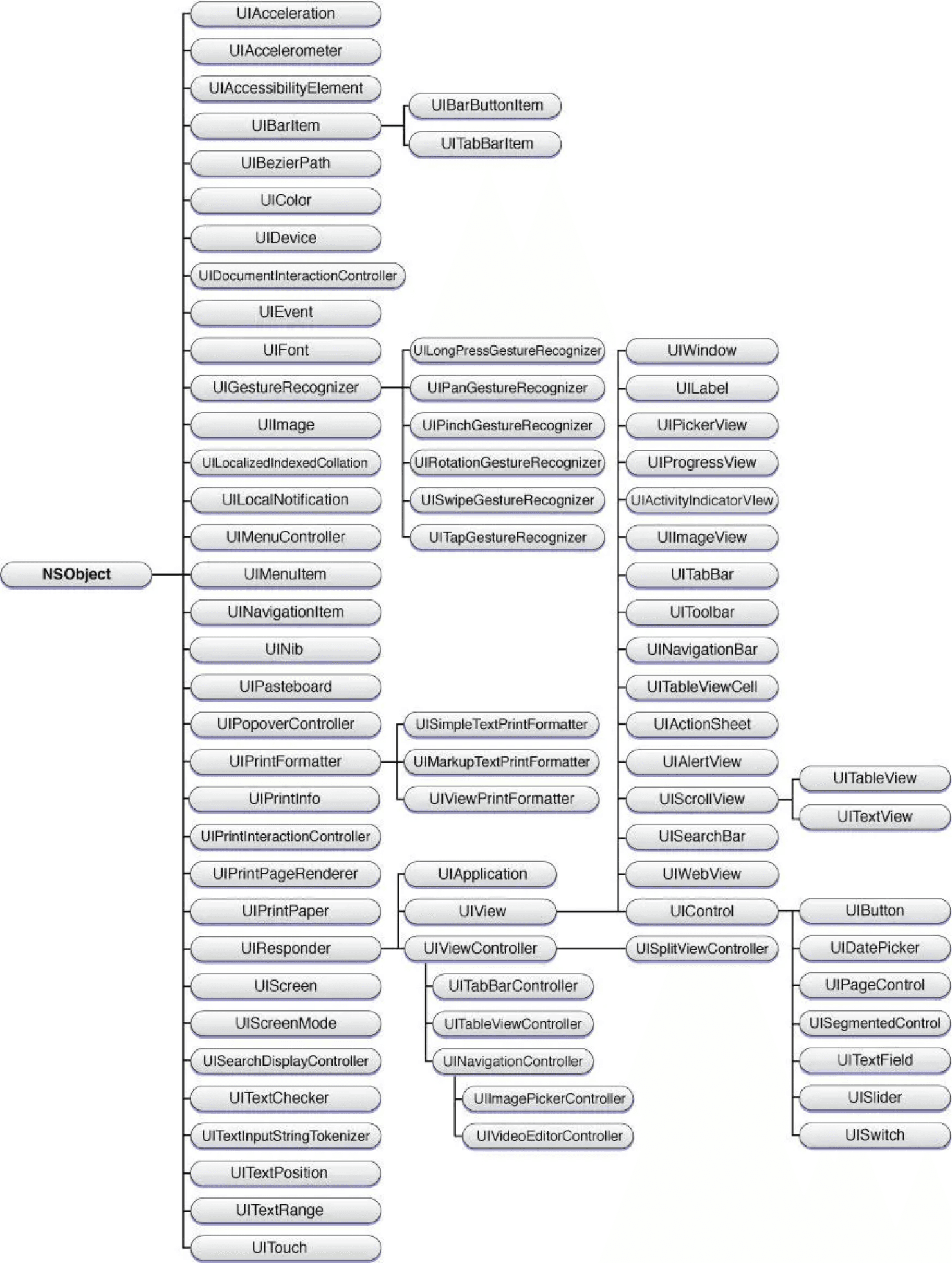 Below is the inheritance relationship of important members of UIKit and their respective roles: