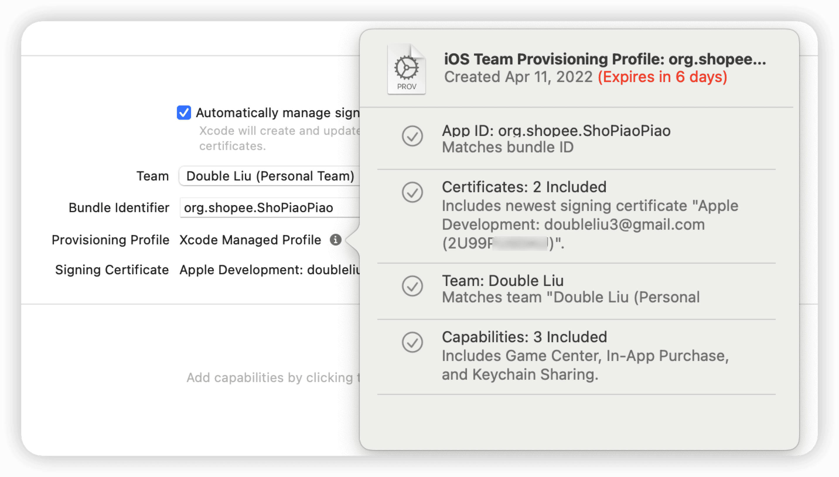 - First, Xcode checks whether the bundle ID in the app matches the App ID in the PP file and whether the permissions declared in the app's Entitlements (.entitlements) file are within the range of allowed permissions in the PP file. If either condition is false, the check fails;